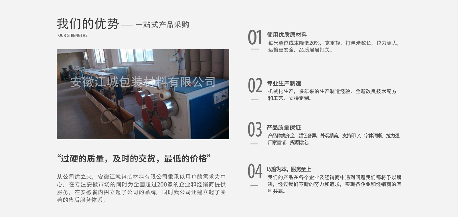 安徽江城包裝材料有限公司成立于2008年,注冊(cè)于2010年,公司總部設(shè)立在安徽蕪湖,是安徽省內(nèi)專業(yè)生產(chǎn)與銷售打包帶、透明膠帶的公司之一。公司主要效勞于大中小企業(yè),并大力開(kāi)發(fā)省內(nèi)經(jīng)銷商。公司以“過(guò)硬的質(zhì)量,及時(shí)的交貨,低的價(jià)格”,為企業(yè)的立身之本。希望用我們的不懈努力,帶給我們客戶大的效益。從公司建立來(lái),安徽江城包裝材料有限公司秉承以用戶的需求為中心,在專注安徽市場(chǎng)的同時(shí)為全國(guó)超過(guò)200家的企業(yè)和經(jīng)銷商提供服務(wù),“過(guò)硬的質(zhì)量,及時(shí)的交貨,低的價(jià)格”博得了縱多的企業(yè)和經(jīng)銷商的好評(píng),在安徽省內(nèi)逐步樹(shù)立起了公司的品牌,同時(shí)我公司還建立起了完善的售后服務(wù)體系。為我們的產(chǎn)品在各個(gè)企業(yè)及經(jīng)銷商中遇到的問(wèn)題予以解決,經(jīng)過(guò)我們不斷的努力和追求,實(shí)現(xiàn)各企業(yè)和經(jīng)銷商的互利共贏。